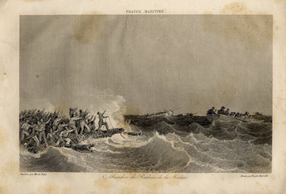 Commandée par le capitaine Hugues Duroy de Chaumareys, elle est partie de Rochefort le 17 juin 1816 et s'est échouée le 2 juillet sur le banc d'Arguin, au large de la Mauritanie. La faute au non-respect d'indications. Croyant pouvoir alléger la frégate de ses marchandises, un radeau est construit. "Les charpentiers et les vivandiers vont s'employer à le réaliser, à partir de bois destiné au comptoir colonial. Il avait la forme d'une palette retournée", explique Marie Chouleur, conservatrice en chef du patrimoine au Service historique de la Défense. En raison d'une voie d'eau sur la frégate, 150 hommes d'équipage vont prendre place sur ce radeau ingouvernable. Au terme de quinze jours de dérive, seule une quinzaine survivra.
